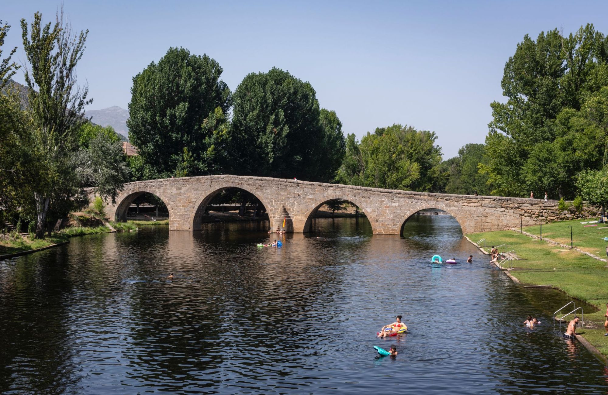 Sin duda, su entorno es uno de los grandes atractivos. El paso del río Alberche por el municipio configura amplias zonas de baño y descanso, muy frecuentadas en los meses más cálidos. Pasear por sus orillas o cruzar el emblemático Puente Románico de Navaluenga permite sumergirse en la historia y contemplar uno de los símbolos más representativos del municipio. Este puente de origen medieval, perfectamente conservado, conecta ambas orillas y ofrece una de las estampas más fotografiadas del pueblo.